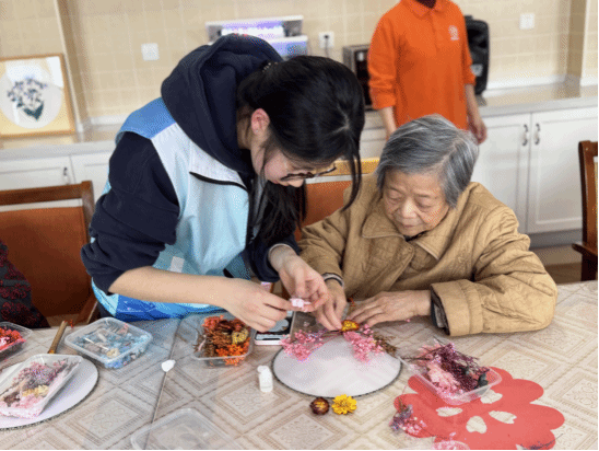在“心系桑榆晚,情暖夕阳红”敬老志愿服务活动中,信息工程学院“传承雷锋精神,弘扬敬老美德”志愿服务团队走进首慈·乐康养护院。活动现场,志愿者们悉心搀扶老人就座,倾听生活故事,帮助整理桌椅、清洁卫生。在“巧手制团扇”环节,志愿者与老人们围坐一堂,共同构图、粘贴干花、描绘扇面。素白的团扇在老少配合下变得色彩斑斓,扇出了代际间的浓浓温情,老人们脸上洋溢着孩子般的笑容。