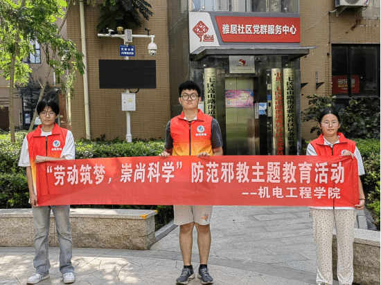 为深化机电工程学院青年学子的社会责任意识,弘扬科学精神,筑牢抵御不良思想的防线。7月25日,机电工程学院团总支联合郑州市二七区长江路雅居社区党群服务中心开展了“劳动筑梦,崇尚科学”防范邪教主题暑期社会实践活动。活动以劳动实践结合科普宣传的形式组织志愿者深入社区传递科学理念,助力营造文明和谐的社区氛围。